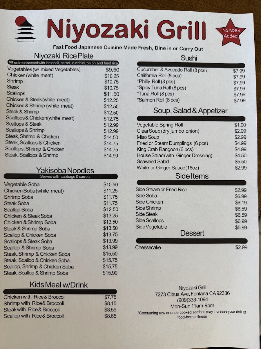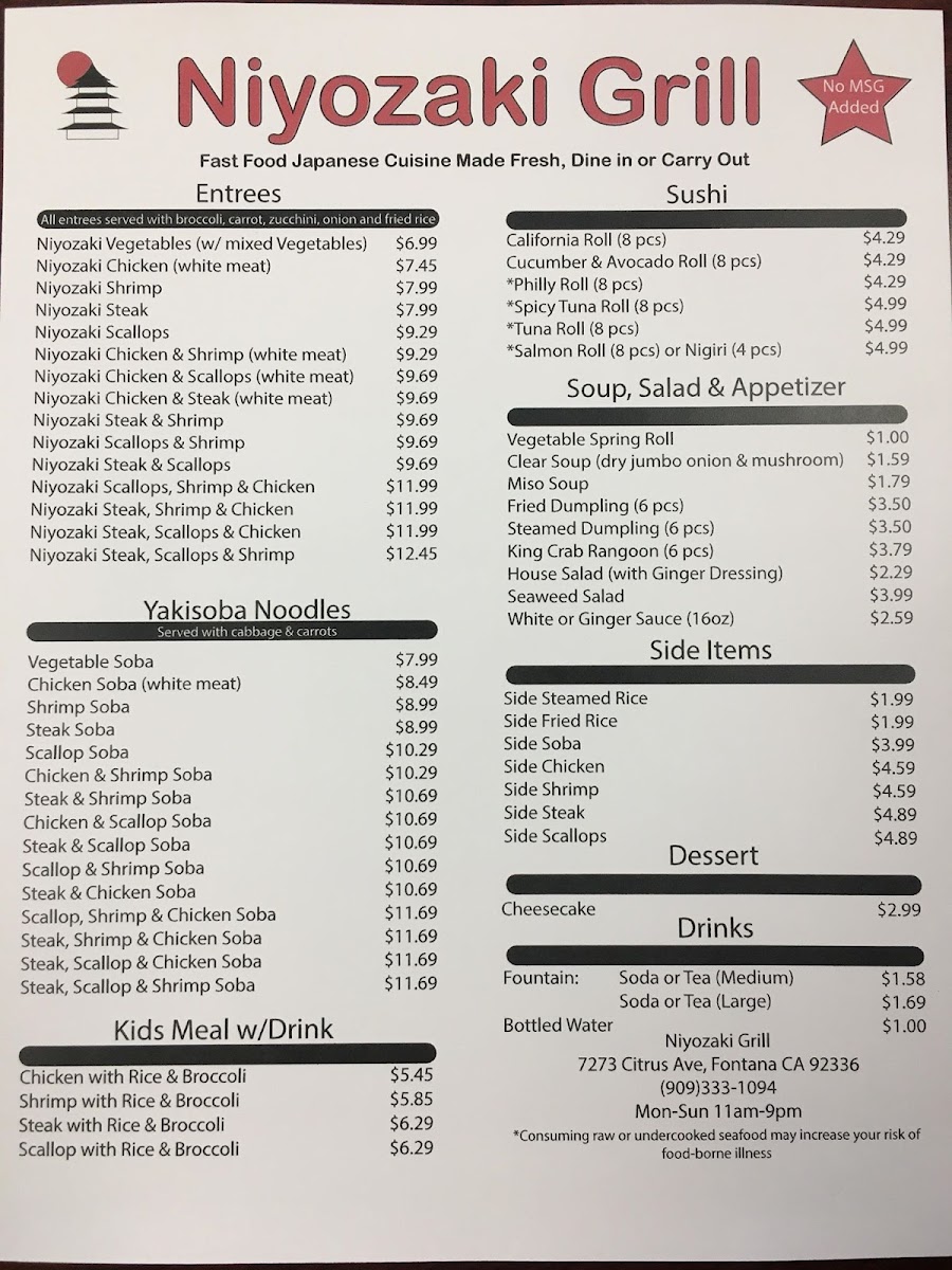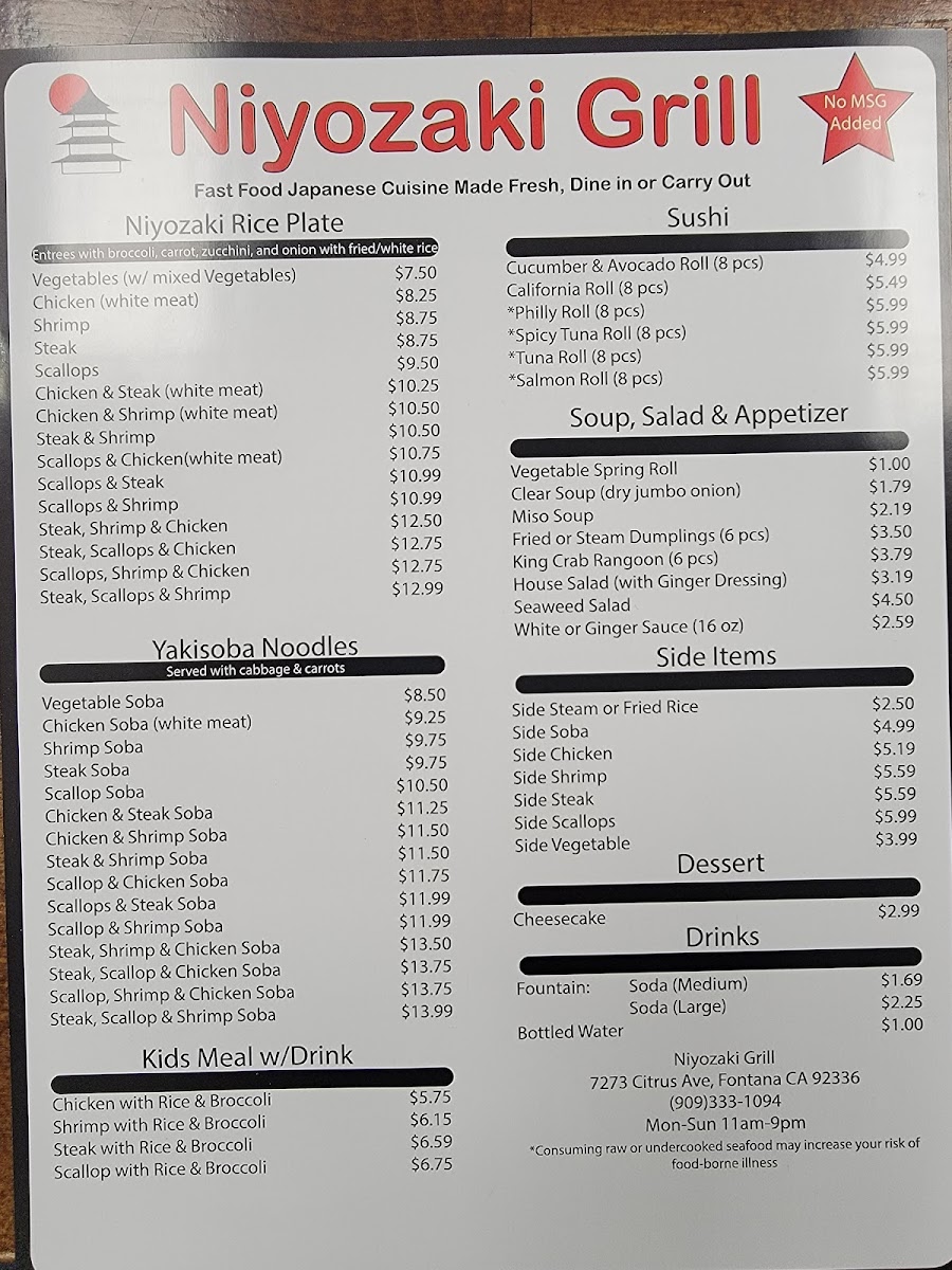 The menu at Niyozaki Grill offers a straightforward selection of Japanese and sushi dishes that feel at home in a relaxed, family-friendly setting. It’s a place where simple, well-prepared meals meet everyday comfort, making it easy to enjoy a satisfying bite whether you’re stopping by for a casual lunch or a laid-back dinner.